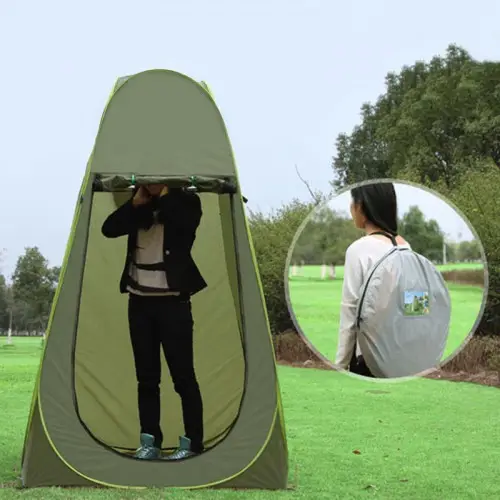 Зовні намет з вікном на блискавці і великими дверима виготовлений з водостійкого матеріалу Oxford, всередині автоматичний намет душ-туалет оснащений покриттям, що тепловідбиває.