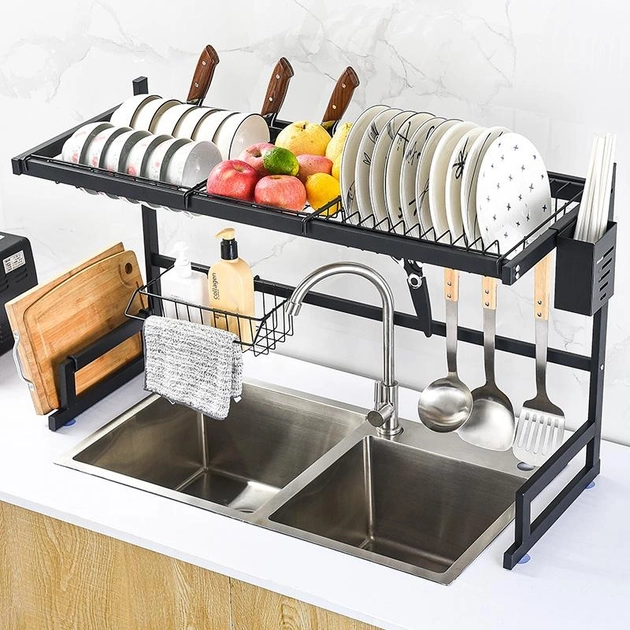 Багатофункціональна Двоярусна полиця – органайзер JYH для сушіння посуду над раковиною, чорна 65 см