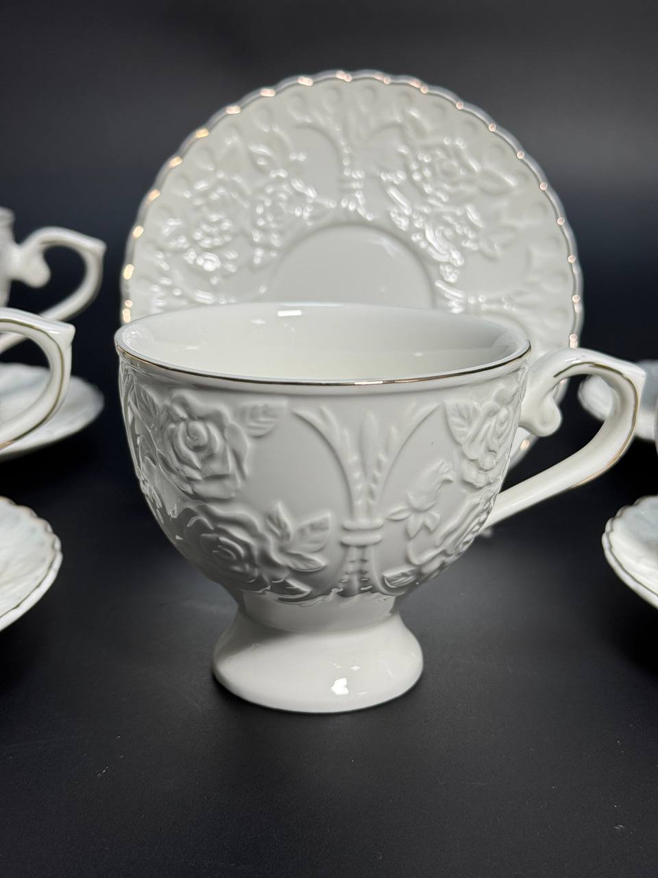 Чайний сервіз L-MG-8212J – з тонким рельєфним малюнком та тонкими смужками. Легкий, витончений та дуже естетичний, він доповнений акуратним золотим обідком, що надає святкового настрою. Ідеально підходить для затишних чаювання або стильного подарунка.
