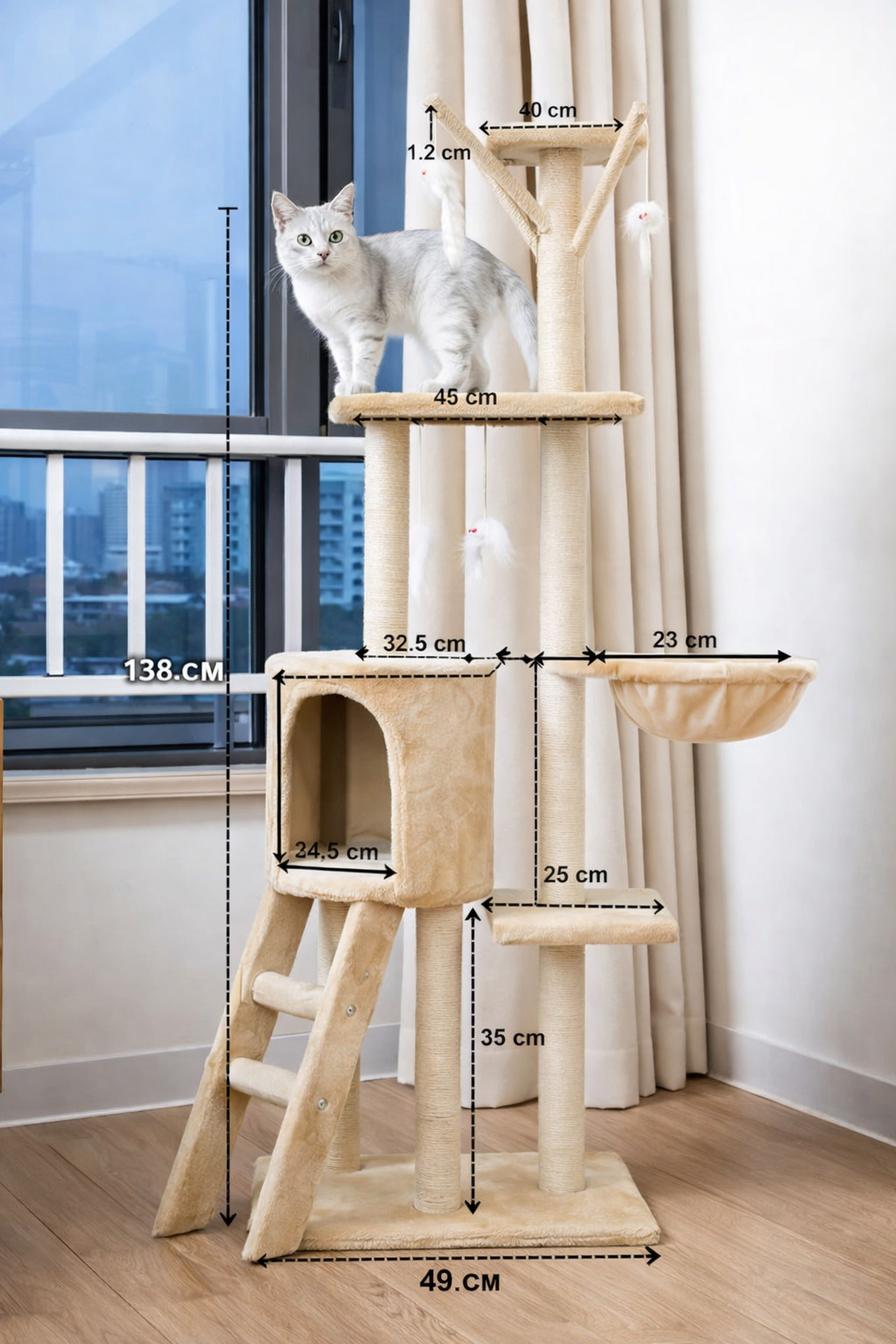 Високоякісна багатофункціональна модель кігтеточки пропонує різні форми активності та відпочинку для вашої кішки. Вона може задовольнити потреби навіть найвибагливіших домашніх тварин. 5-рівнева кігтеточка-вежа обладнана кігтеточками, 3 оглядовими майданчиками, ліжком та сходами, що ведуть у будиночок, обшита приємним на дотик плюшевим матеріалом. Це ідеальне місце, щоб сховатися чи розслабитися. Велика основа забезпечує стабільність та безпеку. Міцна конструкція витримує кішок вагою до 3 кг. Чохол будиночка знімний, тому його можна прати.