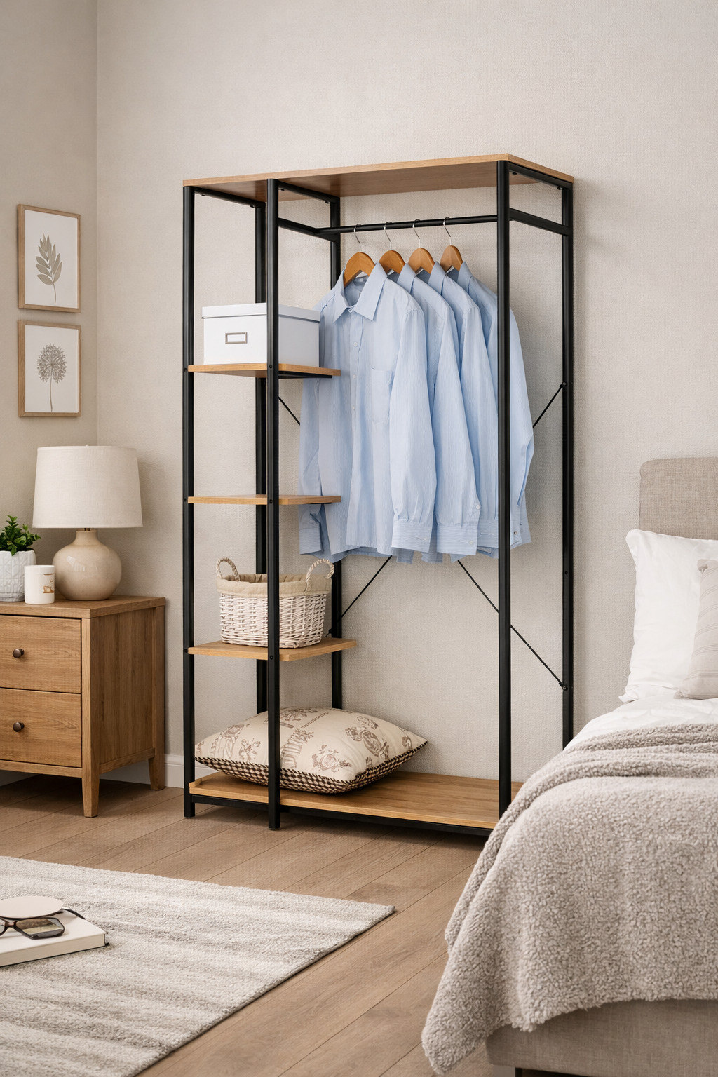 Повноцінна заміна громіздкій шафі для тих, хто цінує простір та естетику. Поєднання міцного металевого каркасу та текстурних полиць під дерево створює сучасний вигляд, що легко інтегрується в будь-який інтер’єр.