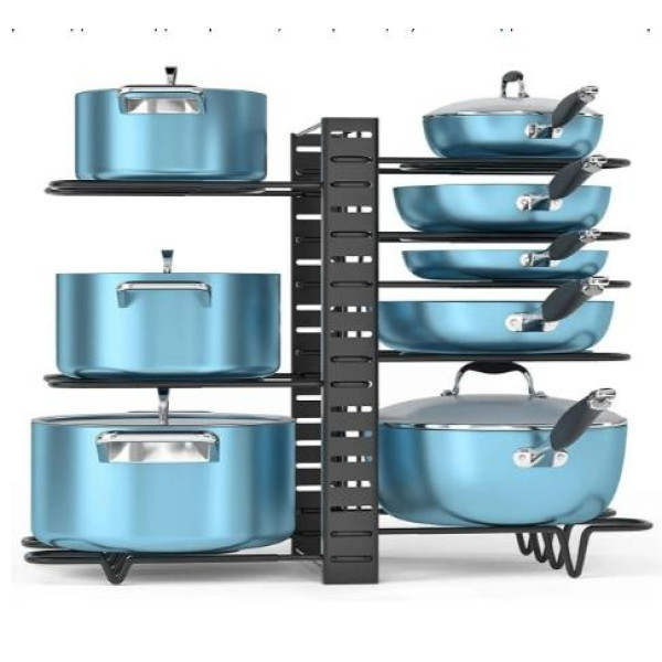 【Великий та компактний】 Наш органайзер для каструль та сковорідок має 8 ярусів; що дозволяє зберігати 8 і більше складених один на одного каструль та сковорідок; Компактна конструкція дозволяє заощадити багато місця в кухонних шафах, коморах та стільницях; Відмінний органайзер для каструль та сковорідок під шафою або стільницею.
