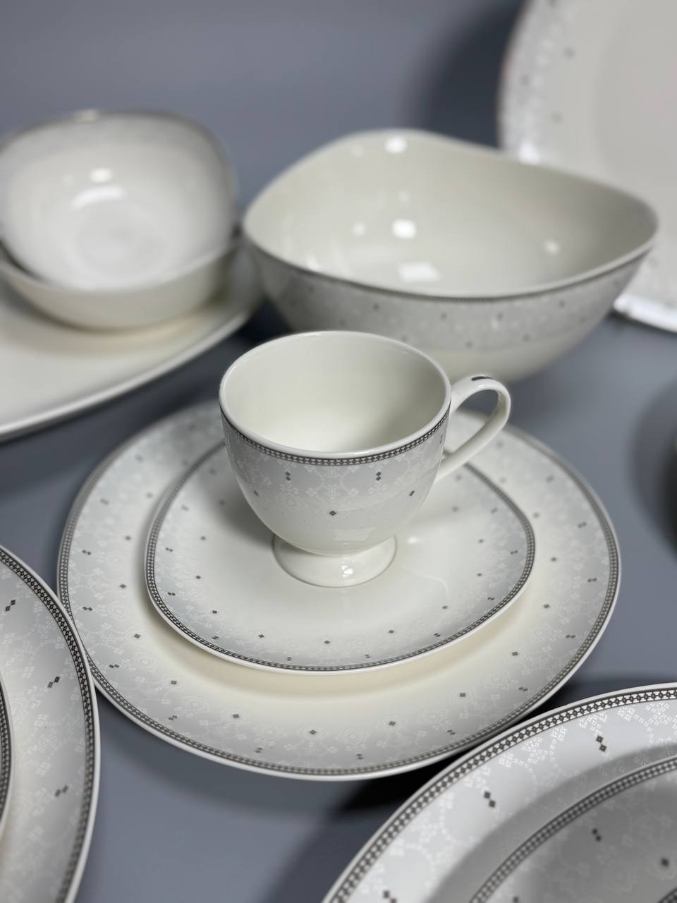 Столовий сервіз RG 1116 вражає своєю благородною простотою. Слоново-кремовий фарфор із плавними формами виглядає дорого та вишукано, а акуратна срібна окантовка підкреслює статусність виробу, додаючи нотку стриманої розкоші.