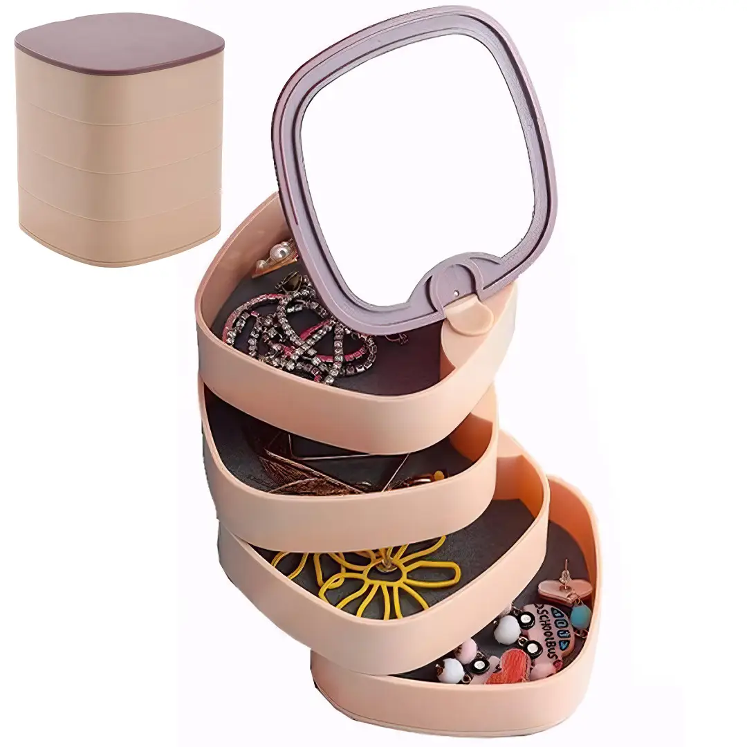 Пластиковий лоток, що обертається на 360 градусів для зберігання аксесуарів – це ідеальне рішення для жінок, які хочуть організувати свої прикраси та дрібні предмети. З витонченим дзеркалом та чотирма зручними скриньками цей органайзер пропонує стильний та функціональний підхід до зберігання.
