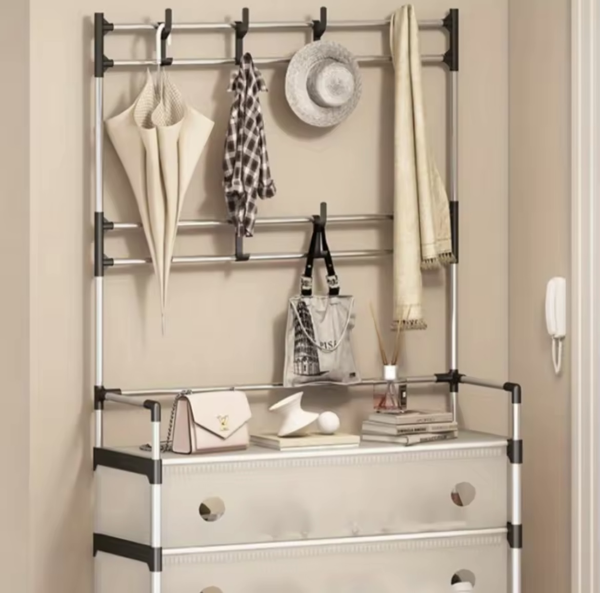 NEW Залізна вішалка для одягу + підставка для взуття, 2 в одному, 4 полиці Бежева