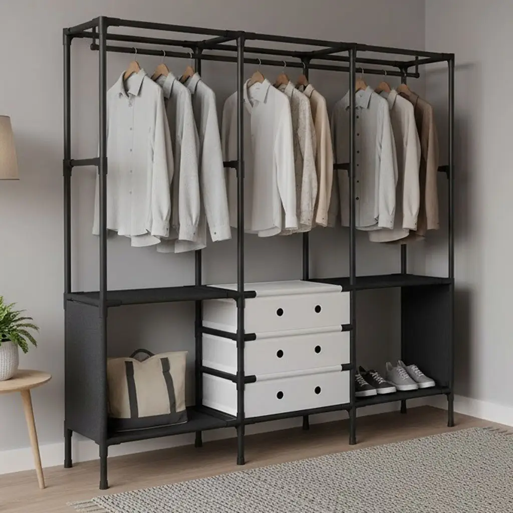 Це ідеальне рішення для організації вашого будинку. Цей стильний гардероб виготовлений з високоякісних сталевих трубок, покритих фарбою, що не тільки надає йому елегантного вигляду, але також забезпечує довговічність та виняткову стійкість. Його продумана конструкція гарантує стабільність і міцність, а значить ви можете бути впевнені, що ваш одяг буде в безпеці та організованості. Гардероб оснащений багатьма практичними полицями, вкритими водонепроникним покриттям, що дозволяють зберігати різні предмети одягу, а також трьома горизонтальними перекладинами для підвішування речей, що полегшує організацію сорочок, курток та суконь. Завдяки шафі ви отримаєте більше місця та порядку у своєму будинку та додасть йому елегантності. Не чекайте більше – інвестуйте в гардероб та насолоджуйтесь найкращою організацією простору!