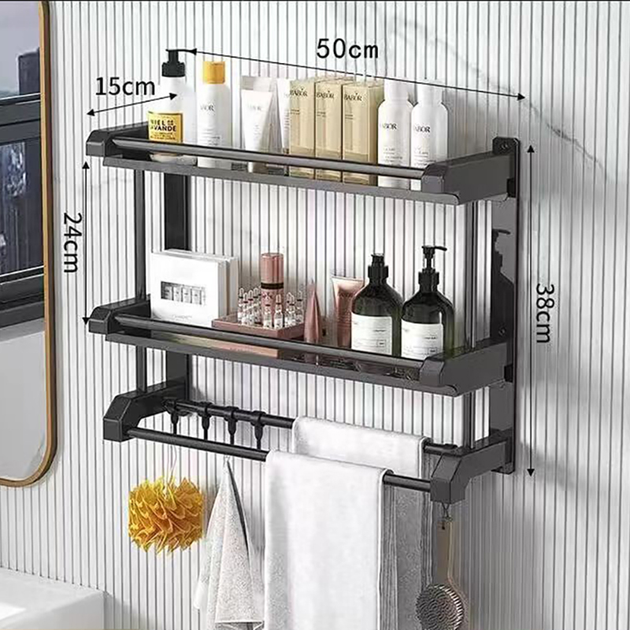 Дві полички для розміщення банного приладдя, внизу полиця поперечина для рушників та поперечина з гачками (розсувними).