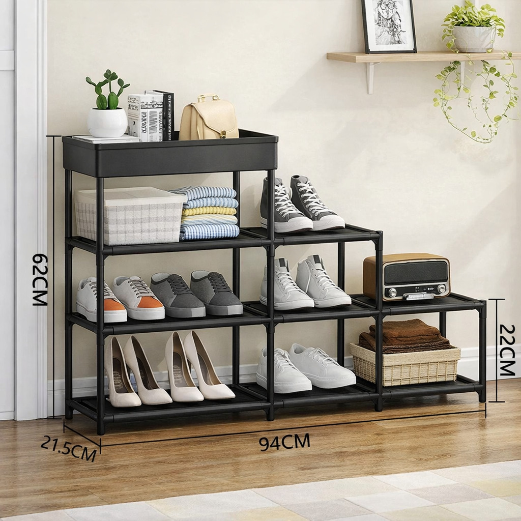 Порядок та функціональність у вашому будинку з цією стильною чорною багатоярусною полицею для взуття. Виготовлена із високоякісних сталевих труб з антикорозійним покриттям, вона забезпечує надійну та довговічну підтримку вашого взуття. Ковпачки на ніжках запобігають ковзанню та захищають підлогу від пошкоджень.