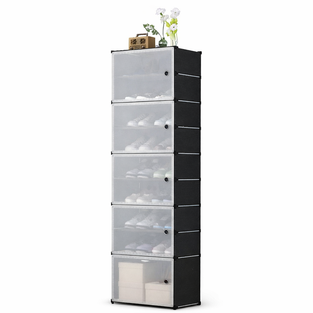 Прозорі дверцята дозволяють легко бачити вміст, а закритий формат захищає взуття від пилу та вологи.