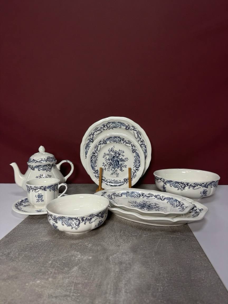 Столовий сервіз DY01 – це витончене поєднання елегантності, якості та практичності. Ніжна біла порцеляна з блакитним орнаментом створює відчуття свіжості, легкості та бездоганного смаку. Візерунок нагадує тонке мереживо, надаючи сервіруванню особливий шарм і романтичний настрій.