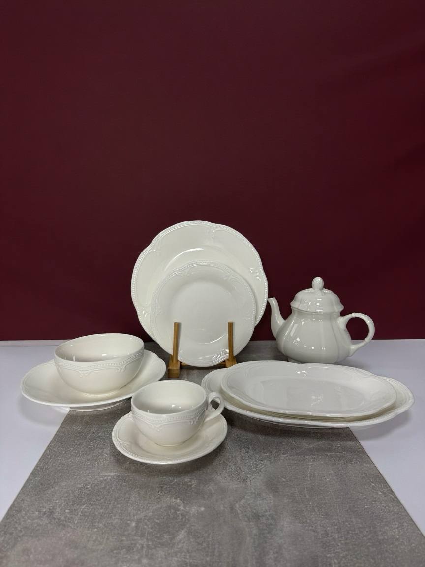 Столовий сервіз DY11 — цей білий столовий сервіз втілює стриману розкіш елегантність. Благородний фарфор із м’яким теплим відтінком підкреслює плавні форми посуду, а делікатний рельєфний кант додає витонченості без зайвої декоративності