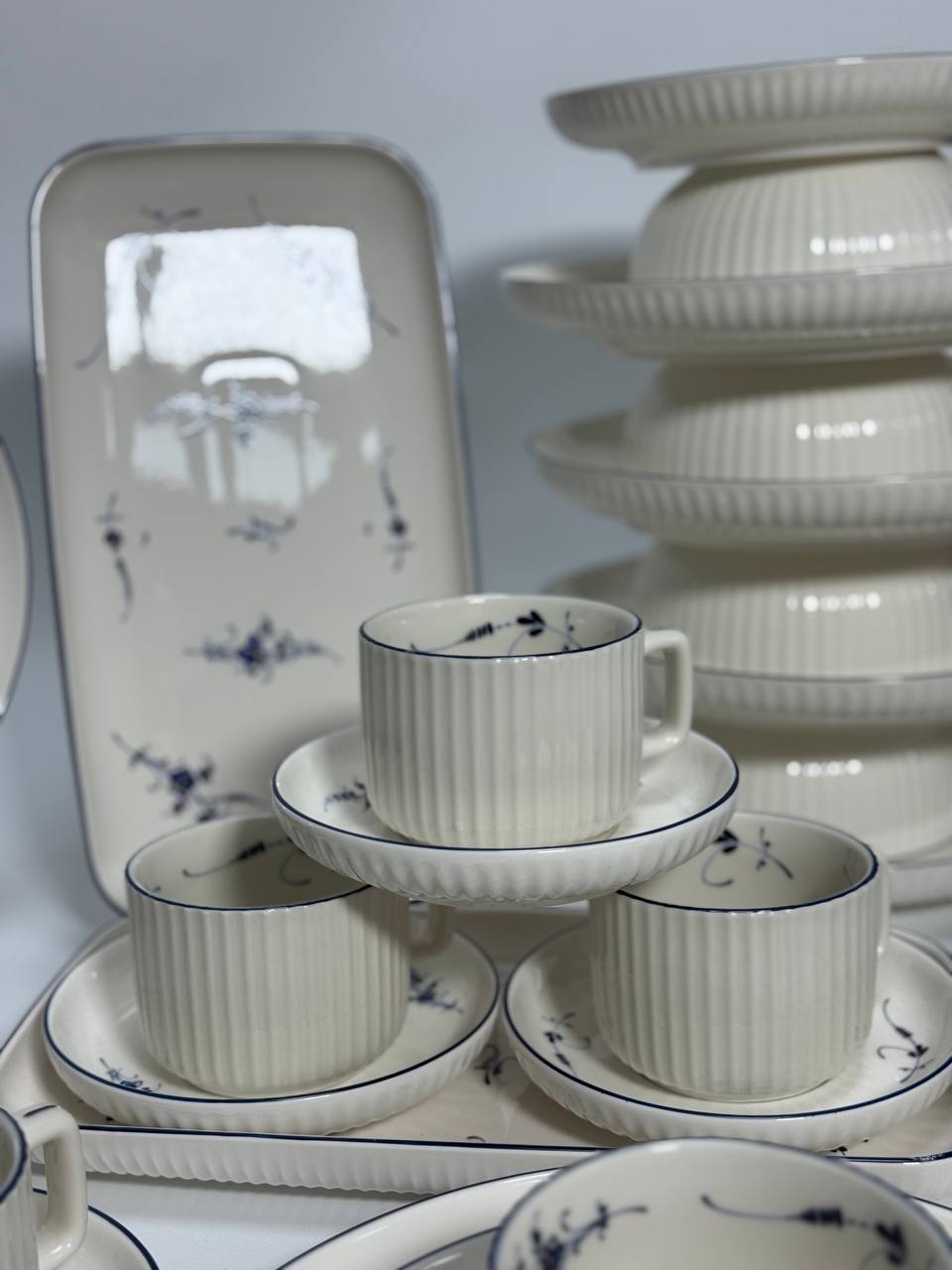 Столовий сервіз RG 1123 — витончений білий порцеляна доповнений тонкою синьою кромкою та легкими блакитними візерунками, що надають посуду особливої ніжності та шарму. Дизайн виглядає повітряно, свіжо та дуже акуратно – без зайвої яскравості, але з характером.