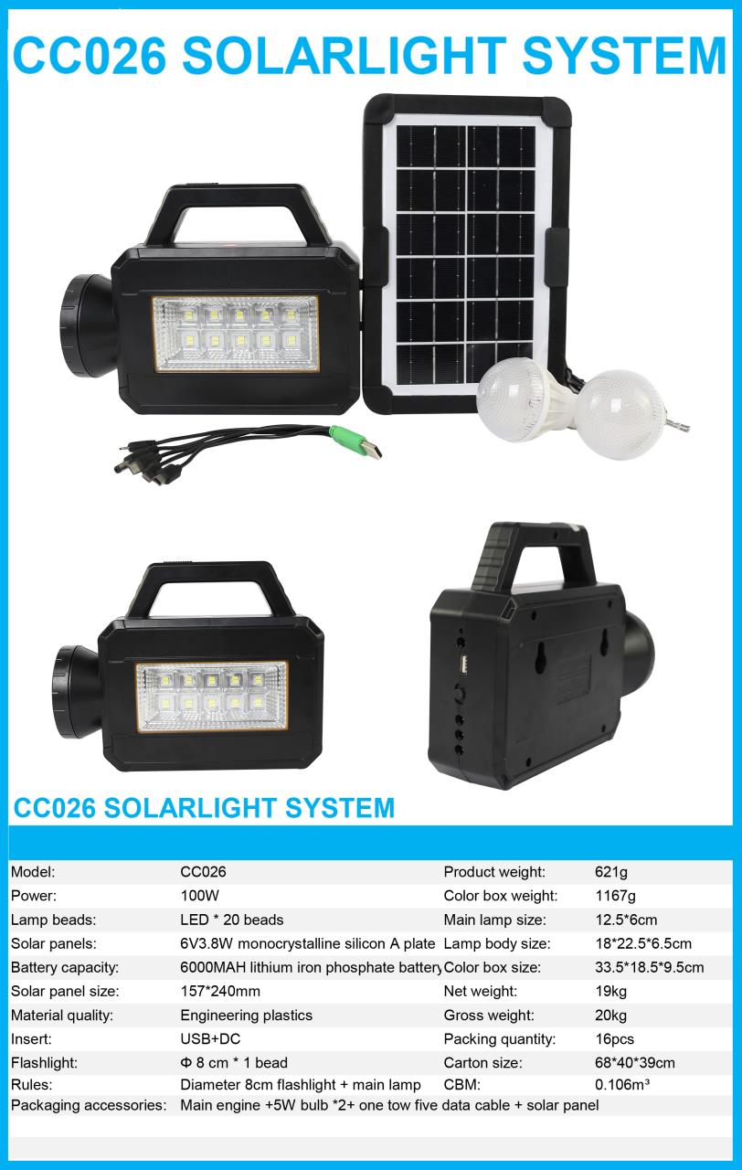 Автономна сонячна система CC026 відмінно підходить як для домашнього користування, так і любителів подорожей. Сонячна панель не залишить вас без освітлення, а також завжди буде можливість зарядити свій мобільний телефон або будь-який інший гаджет. Найкраща знахідка для активного відпочинку.