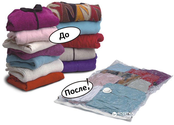 • У вакуумних пакетах можна зберігати не тільки дрібні предмети одягу, але й досить великі речі – наприклад, подушки або пуховики; Створення вакууму всередині пакету дозволяє зберігати одяг