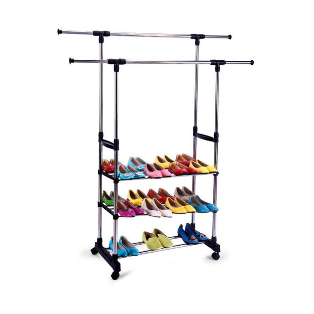 Підлогова, подвійна телескопічна вішалка-стійка для одягу, 3 полиці для взуття 130 х 45 х 160 см