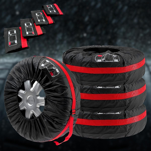 Завдяки цьому комплекту чохлів, колеса вашого автомобіля будуть у чистоті та порядку. Так як протягом року шини змінюються 2 рази (на зимові та літні), то питання зберігання шин дуже актуальне. Вони захищають ваші колеса від пилу, бруду та інших забруднень, які можуть накопичуватися під час зберігання або транспортування. Також у чохлах можна зберігати запасну шину.